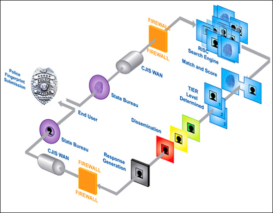 Current RISC responses include the Red/Yellow/Green flag, the category of hit, the FBI number, the master name and the response caveats. The RISC Rapid Search supports multi-tiered enrollment and dissemination policies and maintains unique identities for the individuals enrolled in the repository. (See diagram above.)